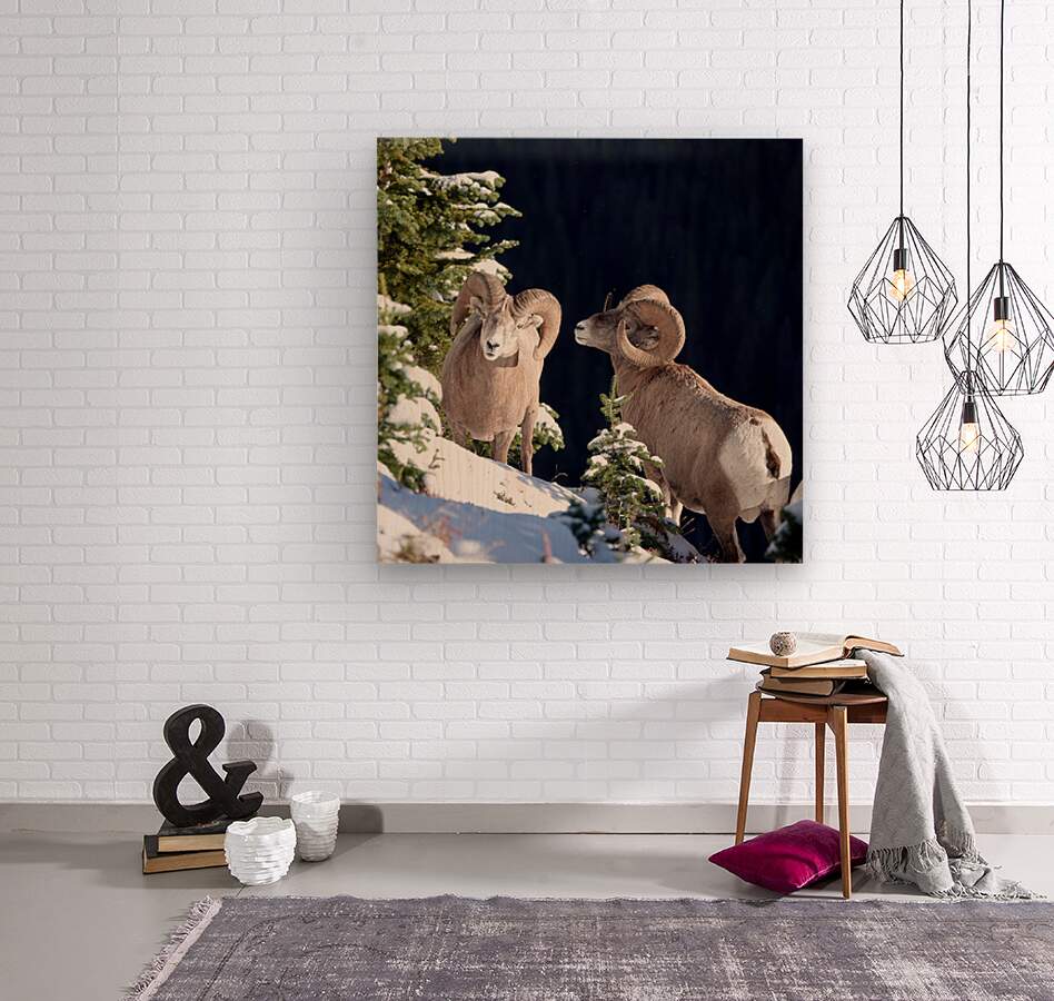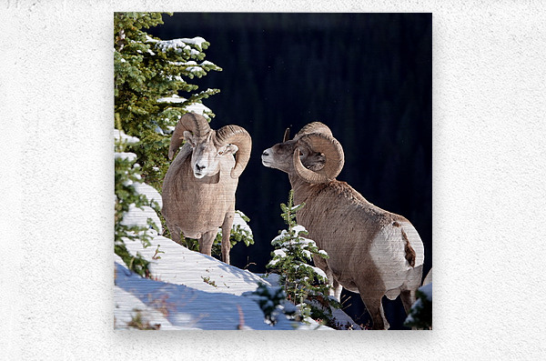 Two Rocky Mountain bighorn rams (Ovis canadensis canadensis) pause in a measured standoff on a snowy slope of Pocaterra Ridge, Kananaskis Country, September 2024