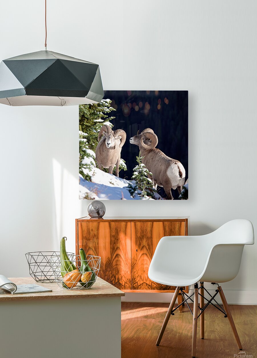 Two Rocky Mountain bighorn rams (Ovis canadensis canadensis) pause in a measured standoff on a snowy slope of Pocaterra Ridge, Kananaskis Country, Sep...[+]