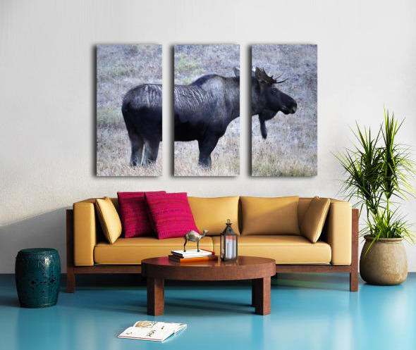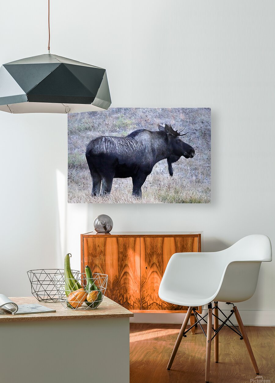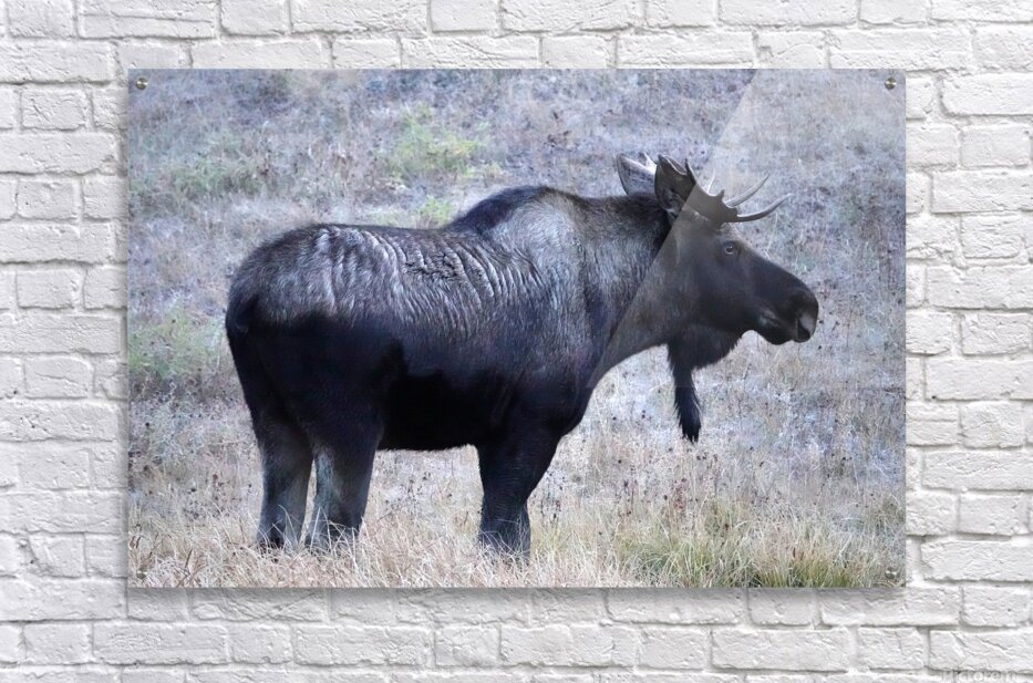 Bull moose (Alces alces) standing in frost-touched meadow, early antlers catching the cold autumn light, Peter Lougheed Provincial Park, Kananaskis Country, October 2022.