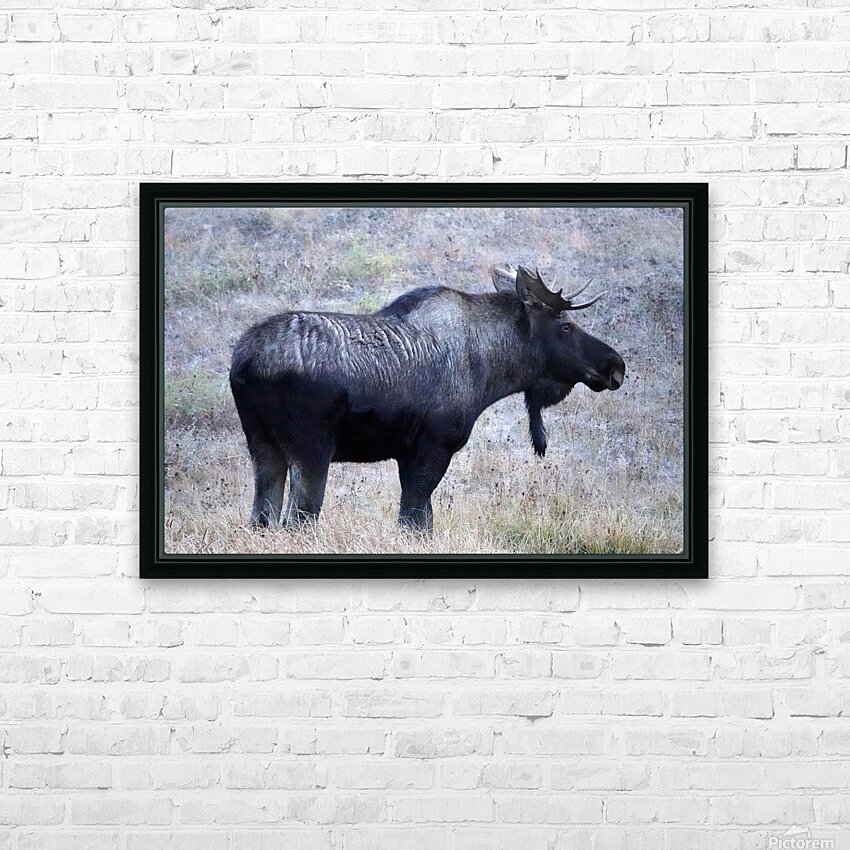 Bull moose (Alces alces) standing in frost-touched meadow, early antlers catching the cold autumn light, Peter Lougheed Provincial Park, Kananaskis Co...[+]