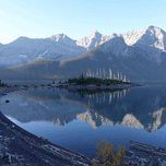 A calm autumn morning at Upper Kananaskis Lake, where a small island catches the first light of the rising sun. Still water mirrors the surrounding pe...[+]