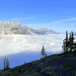 A narrow alpine ridge rises above a dense temperature inversion filling the Spray Lakes valley. Morning light reveals layered limestone peaks emerging...[+]